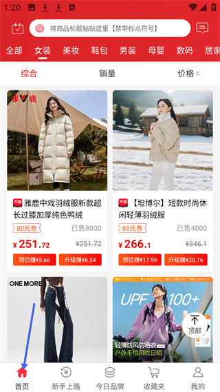 1、首頁有女裝、美妝等商品分類,展示雅鹿、坦博爾等品牌羽絨服,標注價格、銷量及返利金額,可按綜合、銷量、價格排序。