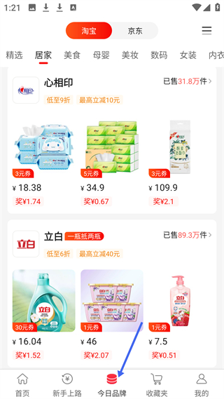3、今日品牌頁面展示淘寶平臺的心相印、立白等品牌商品,如心相印濕巾、立白洗衣液,標注價格、優惠券及返利金額。