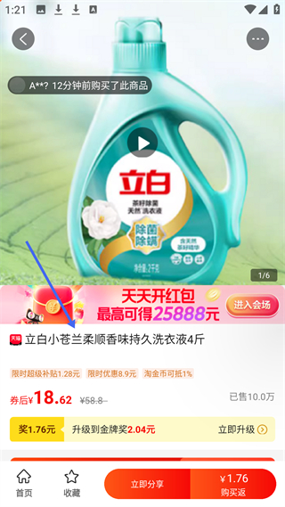 4、立白小蒼蘭洗衣液詳情頁展示價格、銷量及返利金額,有天天開紅包活動入口,可立即分享商品或享受購買返利。