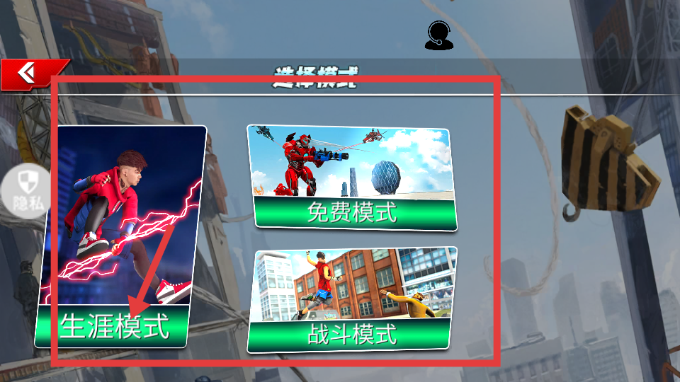 2、進入模式選擇界面,有生涯模式、免費模式、戰斗模式可選,可根據喜好挑選,不同模式玩法和目標不同。