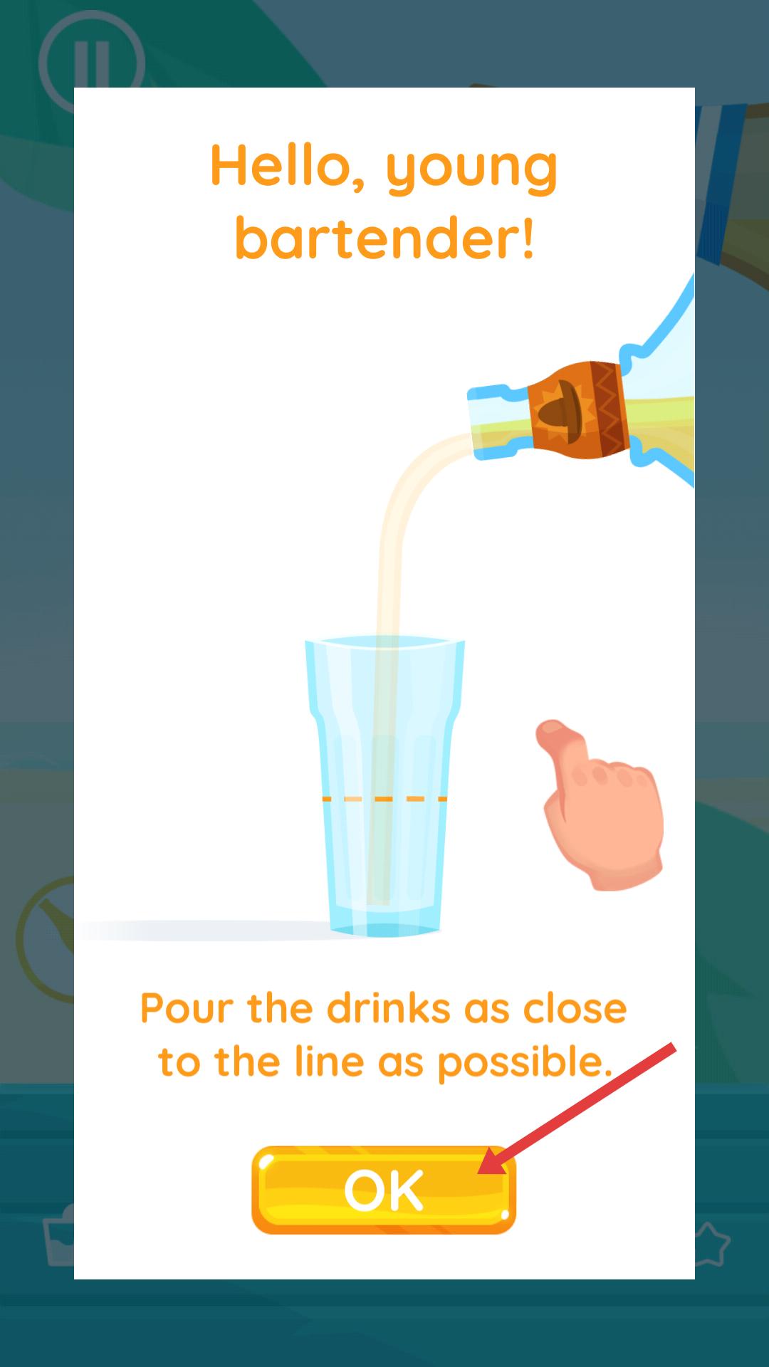 2、界面提示倒酒盡量接近標線,點擊OK按鈕,開始實際操作,學習倒酒技巧,為后續調酒做準備。