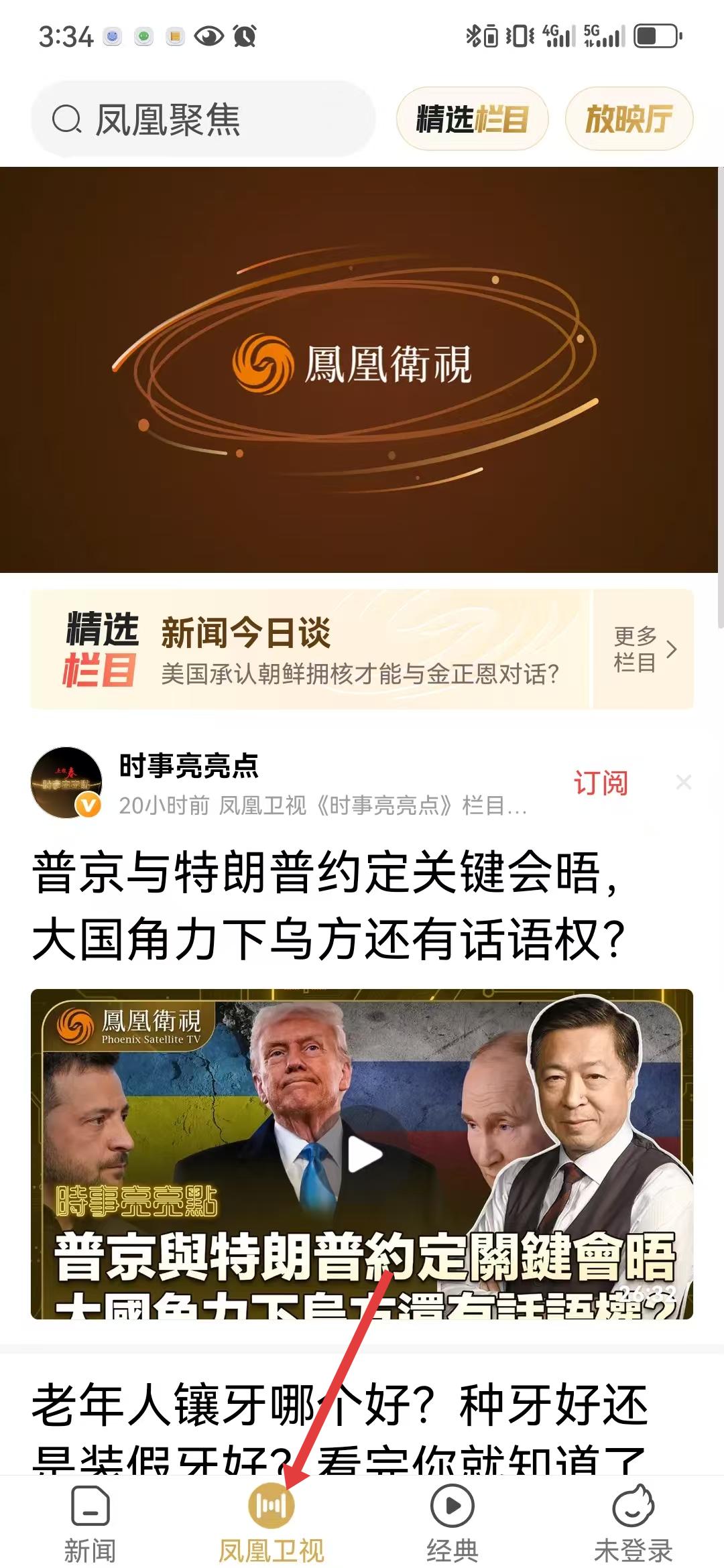 2、點擊底部鳳凰衛視標簽,進入鳳凰衛視專屬頁面,這里有精選欄目、放映廳等板塊,呈現鳳凰衛視的特色節目,像時事評論、專題報道等內容,可瀏覽相關節目資訊。