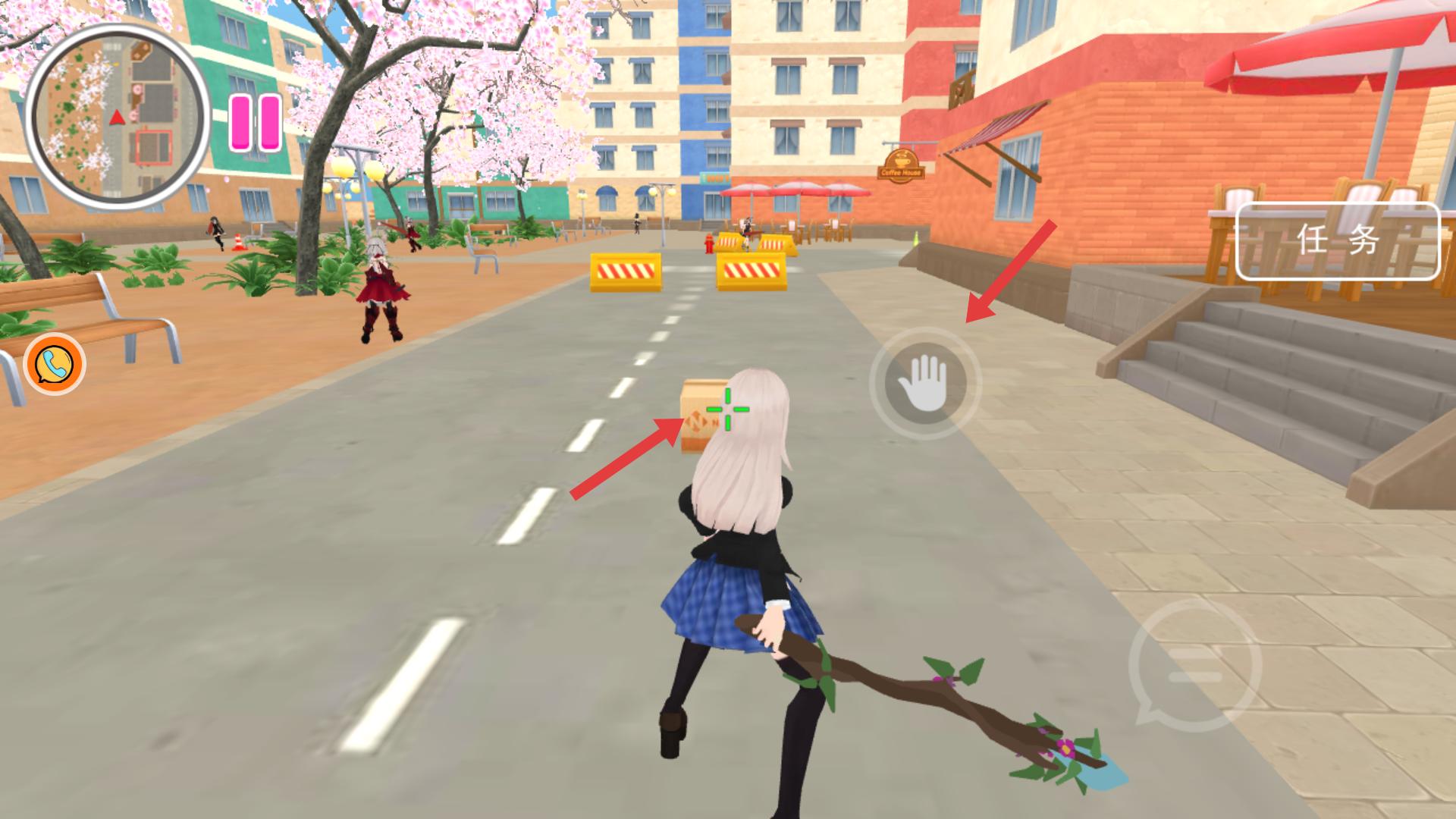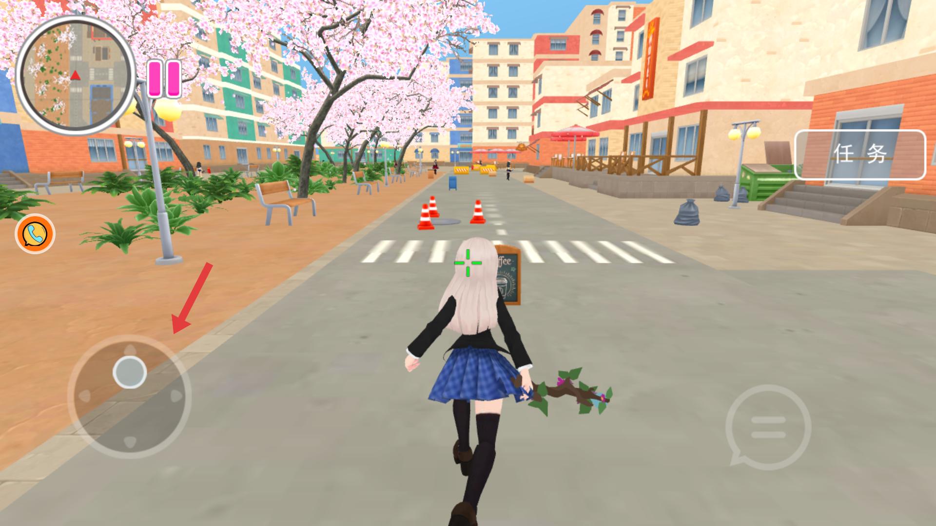 2、用左側搖桿操控角色移動,探索校園街道,留意任務指引,收集道具,與場景互動推進劇情。