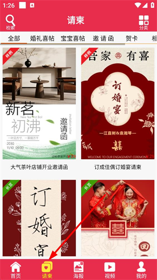 2、點擊請柬進入請柬界面,可選擇全部、婚禮喜帖、寶寶喜帖等分類,查看各類請柬樣例,如大氣茶葉店鋪開業邀請函、訂婚宴請柬等,選擇心儀的請柬模板。