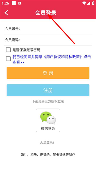 4、會員登錄界面可輸入會員賬號和密碼,勾選保存賬號密碼和同意用戶協議及隱私政策后點擊登錄,也可選擇注冊或微信登錄,登錄后可享受更多請柬制作服務。