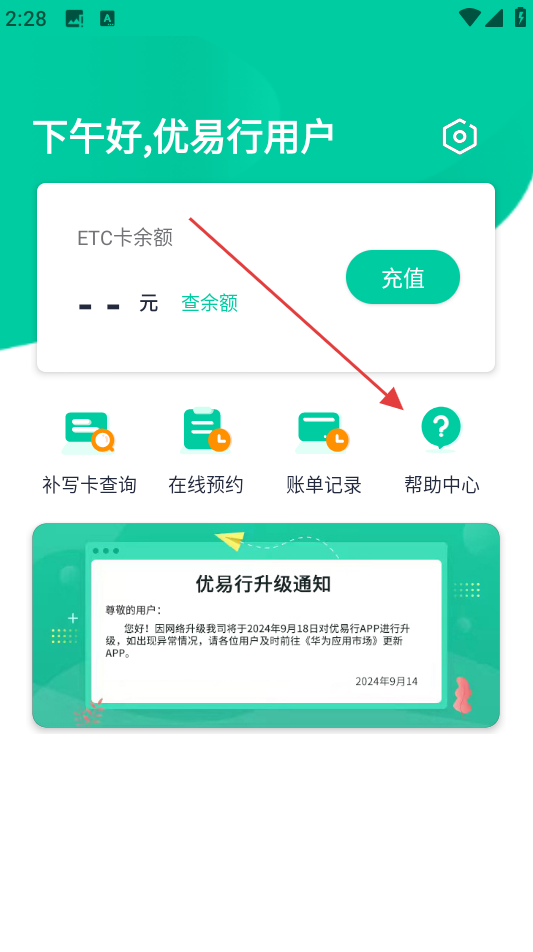 2、登錄后進入首頁,查看ETC卡余額等信息,點擊幫助中心圖標,進入幫助中心頁面,了解APP使用相關幫助內容。