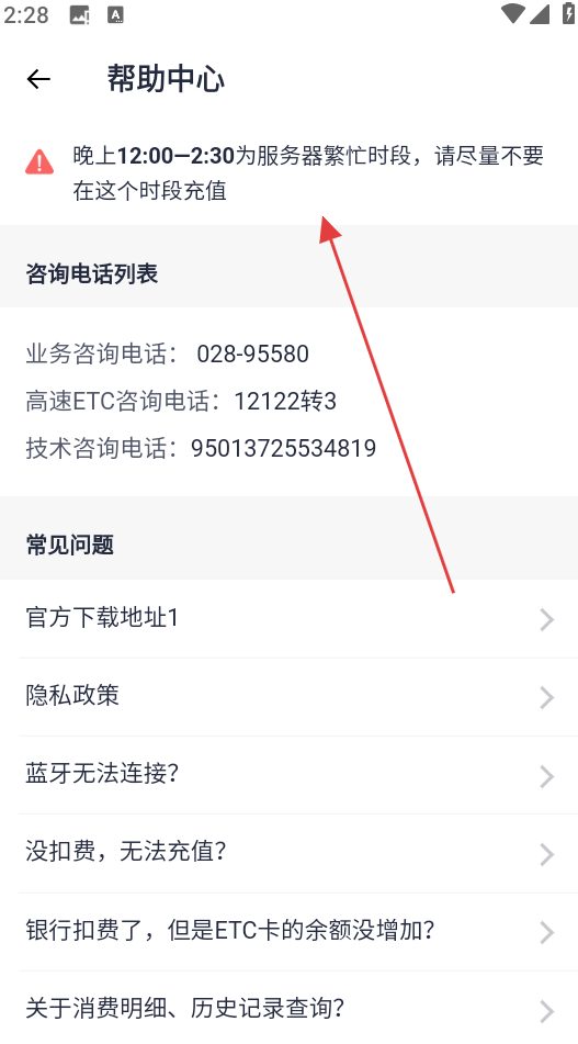 3、在幫助中心,查看服務器繁忙時段提示,知曉業務咨詢高速ETC咨詢技術咨詢等電話,瀏覽常見問題及解答,解決使用疑問。