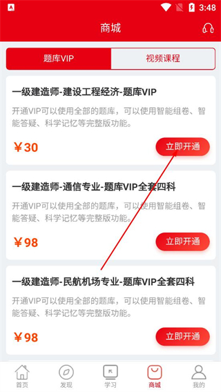 4、挑選目標題庫VIP套餐點擊對應套餐旁的立即開通按鈕,按照頁面提示完成支付操作,即可開通該題庫VIP的相關功能權限。