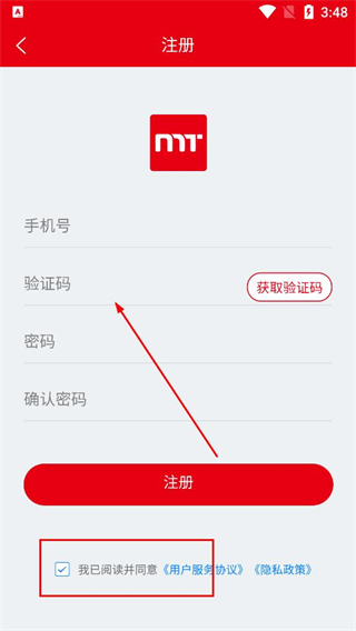 3、在注冊頁面點擊手機號輸入框填寫號碼,點擊獲取驗證碼,輸入收到的驗證碼,填寫密碼并確認密碼,勾選同意協議后點擊注冊按鈕。