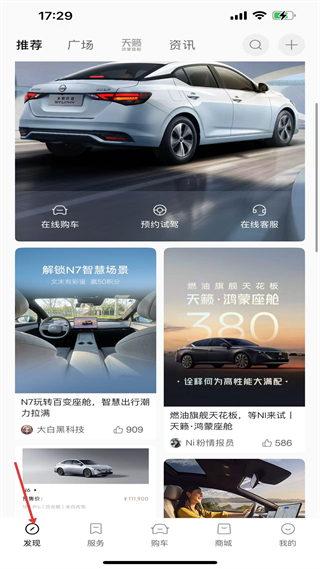 1、發現頁,展示全新軒逸等日產車型資訊,提供在線購車、預約試駕入口,是品牌信息與核心服務的聚合頁面。