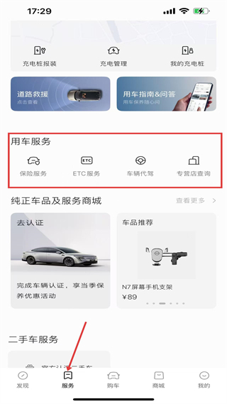 2、服務頁,含充電樁報裝、道路救援等用車服務,還有保險等配套服務,是車主用車的服務支持頁面。