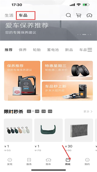 3、商城頁,聚焦車品消費,提供保養推薦、輪胎等車品,設限時秒殺活動,是汽車用品的購買優惠頁。