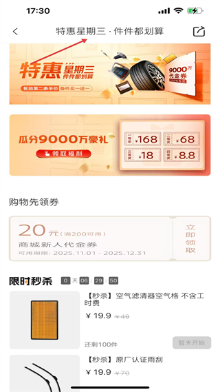 4、特惠活動頁,展示特惠星期三活動,含輪胎半價等優惠,可領券參與秒殺,是商城促銷詳情頁。