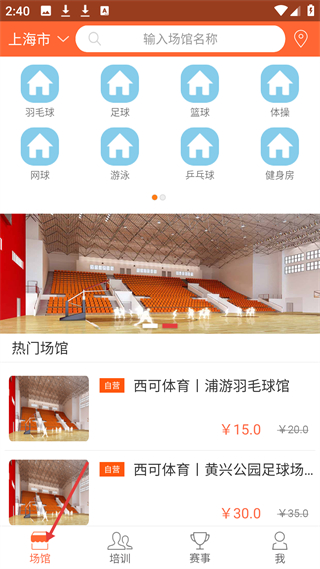 1、場館以上海為定位,設置羽毛球、足球等多種運動分類入口,展示熱門場館及價格,方便用戶查找和預訂體育場館。