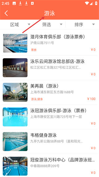3、游泳板塊羅列多家游泳館,標注地址、價格及票券信息,方便用戶預訂游泳場館和票券。
