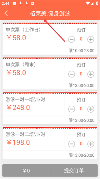 4、場館詳情以格萊美健身游泳為例,展示單次票、培訓課程等價格和預訂時段,滿足用戶健身游泳預訂需求。