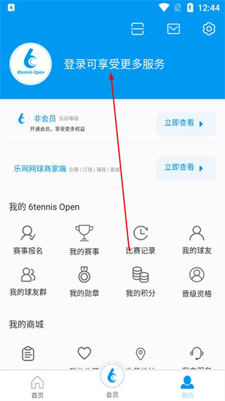 1、進入樂網網球app我的頁面,點擊登錄可享受更多服務區域,進入登錄界面。
