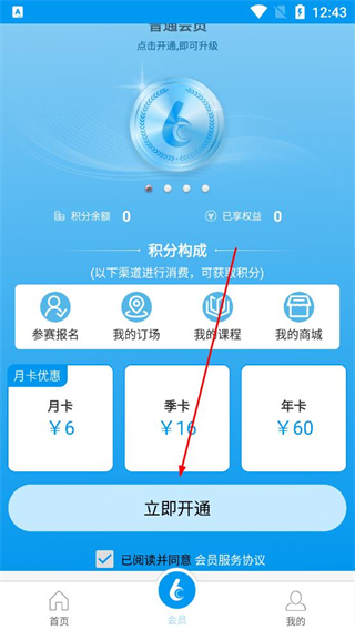 3、登錄成功后返回會員頁面,查看積分構成與會員套餐,選擇月卡優惠選項,確認套餐信息后,點擊立即開通按鈕進入支付環節。