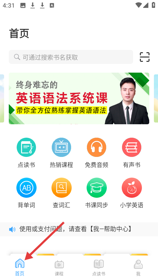 1、首頁頂部設搜索欄,主推英語語法系統課,下方分布點讀書、背單詞等功能入口底部導航欄可切換界面。
