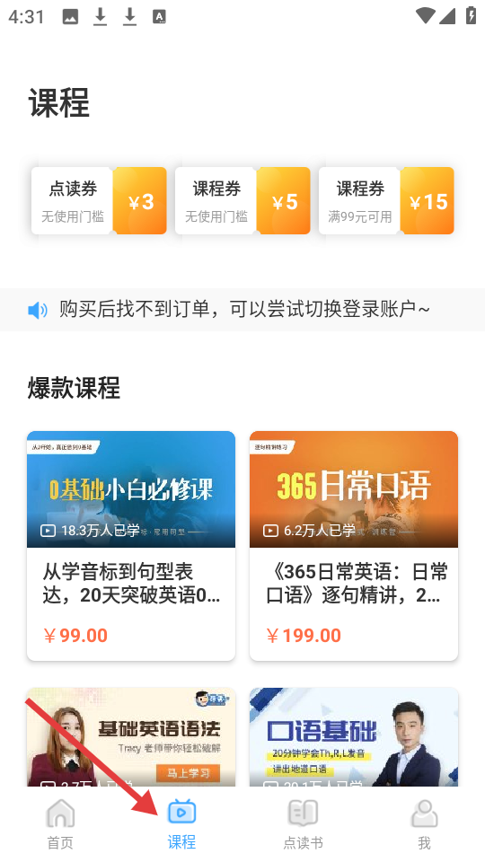 2、課程界面陳列點讀券與課程券,爆款課程區展示課程名稱、價格及已學人數凸顯熱門課程。