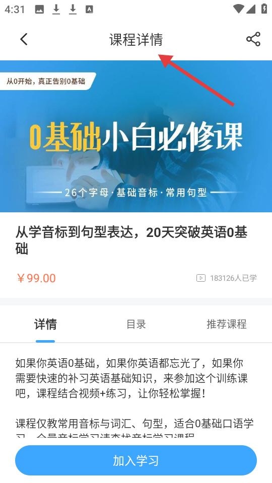 3、課程詳情頁以0基礎小白必修課為例,介紹課程涵蓋內容、價格,顯示學習人數支持加入學習。