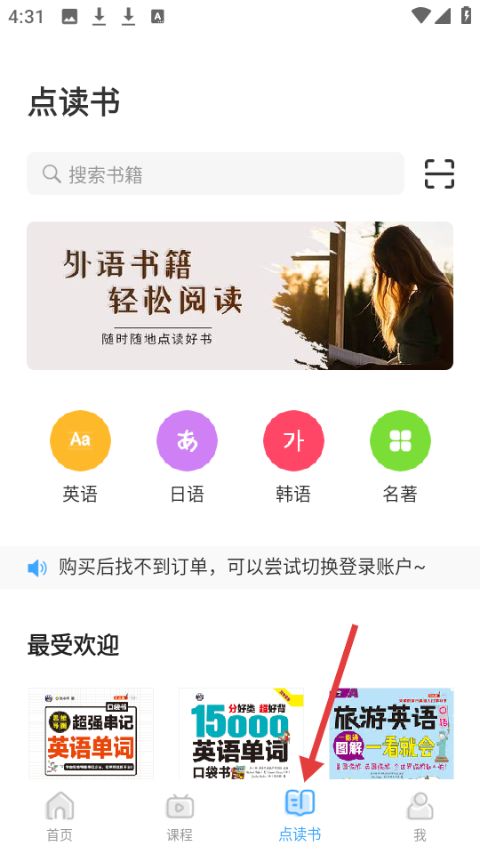 4、點讀書頁面上方有搜索書籍框,劃分外語類別,下方展示最受歡迎的外語書籍底部同樣有導航欄。