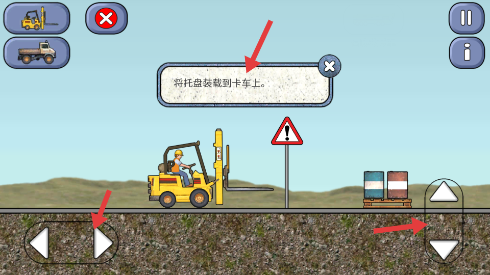 4、第一關任務是將托盤裝載到卡車上,用左右箭頭控制叉車移動,上下箭頭調整叉車叉臂,對準托盤后操作叉臂將其裝載到卡車上完成任務。