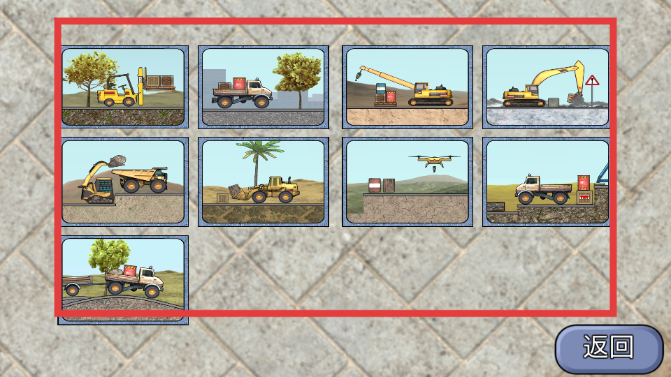 2、進入關卡選擇界面,有多種施工場景卡片,涵蓋叉車、卡車、起重機等不同車輛作業,根據喜好選擇場景,開啟對應施工任務。
