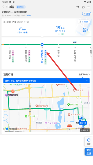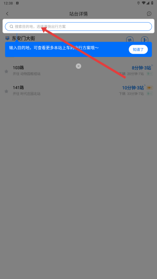 1、進入站臺詳情界面,頂部有搜索框,可輸入目的地查詢出行方案,下方還能看到如東安門大街等站點及相關公交信息。