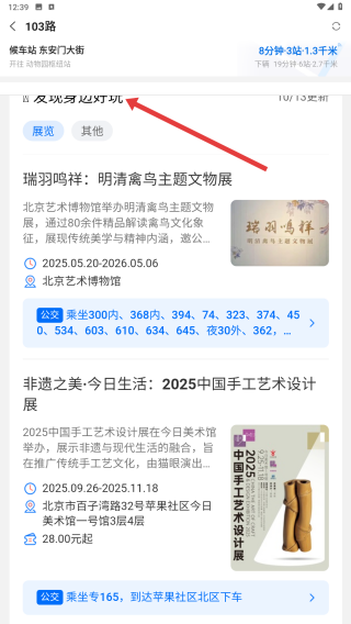 3、在公交相關界面,會有周邊活動推薦,比如瑞羽鳴祥明清禽鳥主題文物展等,還標注了活動時間、地點及公交乘坐建議。