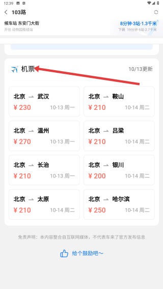 4、此外界面還會展示機票信息,有不同出發地與目的地的航班,標注了價格和日期,方便用戶了解出行票務情況。
