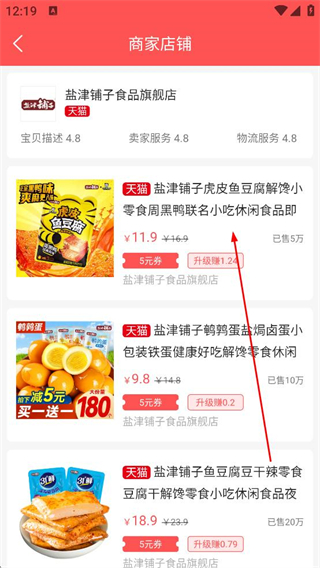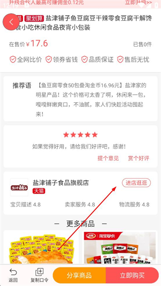 3、在商品詳情頁找到進店逛逛按鈕,點擊進入鹽津鋪子食品旗艦店的店鋪頁面,查看店鋪內的更多商品。