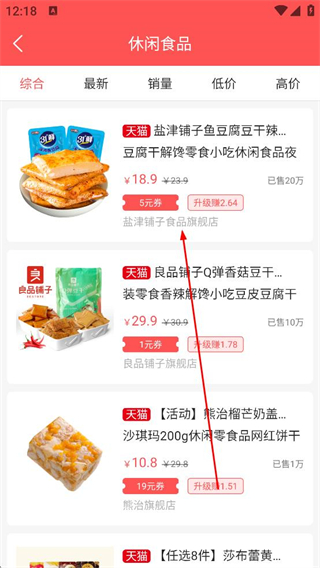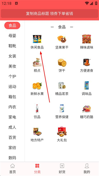 1、打開軟件進入分類頁面,選擇食品板塊下的休閑食品分類,點擊進入休閑食品的商品列表頁面,瀏覽相關商品。
