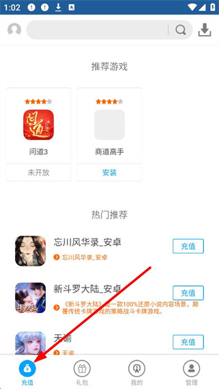 1、進入平臺可見推薦游戲和熱門推薦板塊,有問道3、商道高手等游戲展示,底部有充值、禮包、我的、管理等功能入口,可根據需求點擊操作。