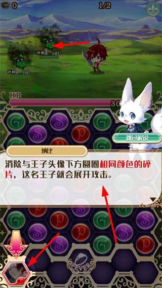 1、消除與王子頭像下方圓圈相同顏色的碎片,該王子會展開攻擊,通過此方式擊敗敵人,推進戰斗。