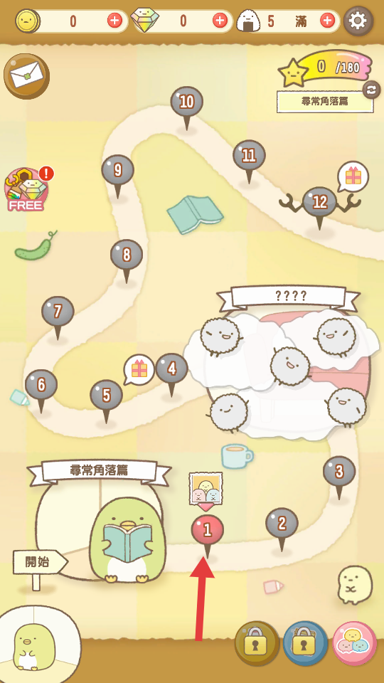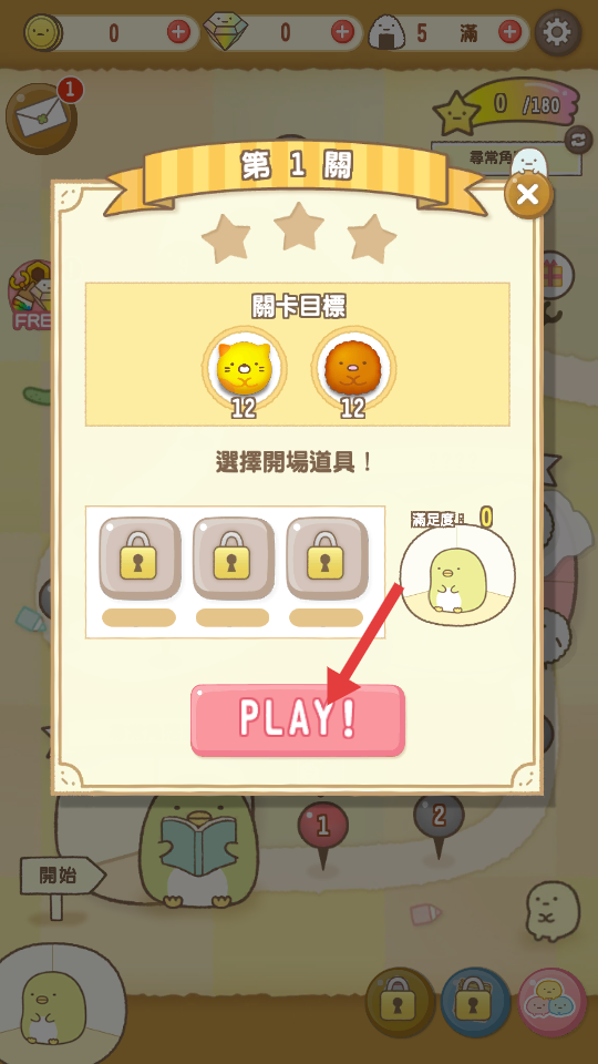 1、在關卡地圖中點擊標有1的紅色關卡標識,進入第一關準備界面,這是開啟游戲闖關的第一步,可開啟第一關的挑戰。