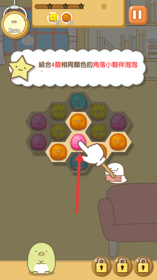 3、游戲中按照提示組合4個相同顏色的角落小伙伴泡泡,通過點擊泡泡進行操作,完成組合可推進游戲進度獲取分數。