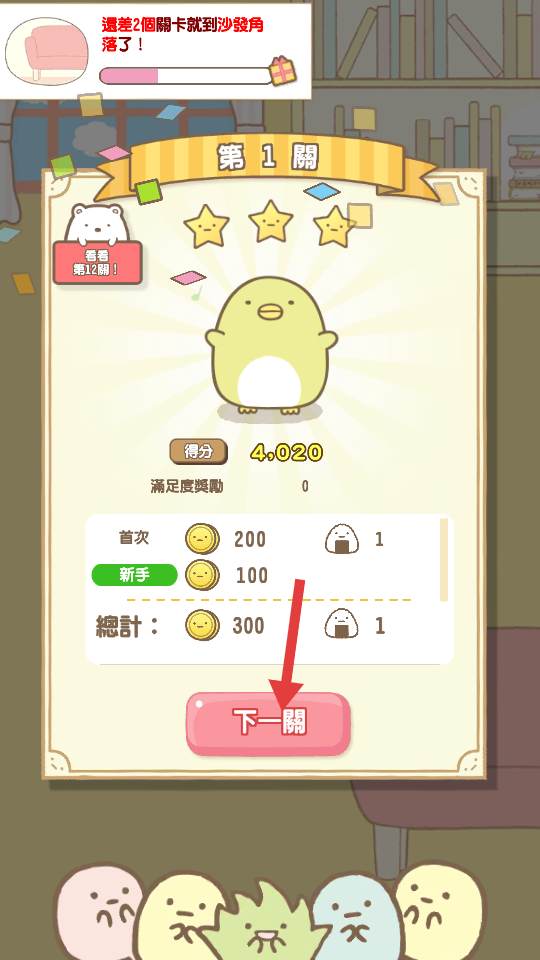 4、成功完成第一關后,會顯示得分和獎勵包括金幣等,此時點擊下一關按鈕,即可進入下一關,繼續新的消除挑戰。
