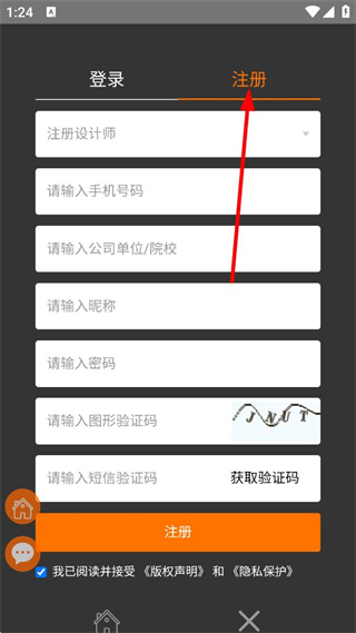 3、進入注冊頁面,需選定注冊類型,填寫手機號、公司單位等信息,完成驗證操作后,點擊注冊推進流程。