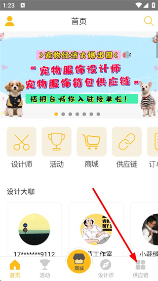 1、進入梧桐臺首頁,可見寵物服飾相關推廣橫幅,還有設計師、活動等功能入口,底部設供應鏈按鈕,點擊該按鈕進入供應鏈頁面。