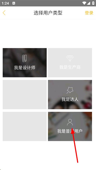 4、進入選擇用戶類型頁面,有我是設計師、生產商等選項,可依據自身身份,選擇對應的用戶類型。
