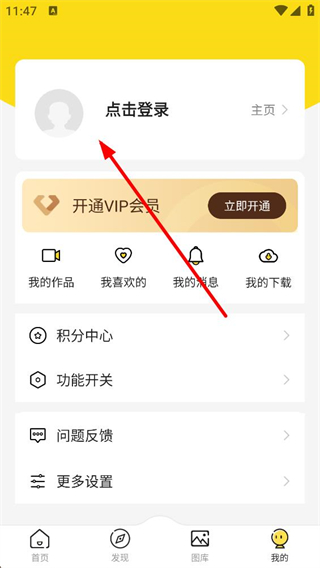 2、進入我的界面后,顯示點擊登錄狀態,含開通VIP及我的作品我喜歡的等功能選項,點擊登錄區域可觸發快速登錄的彈窗界面。