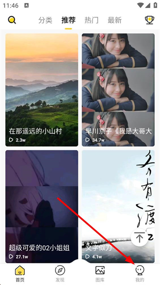 1、進入應用首頁,可見分類推薦熱門最新等標簽,展示多款不同風格的壁紙內容,底部設首頁發現圖庫我的入口,點擊我的可進入對應界面。