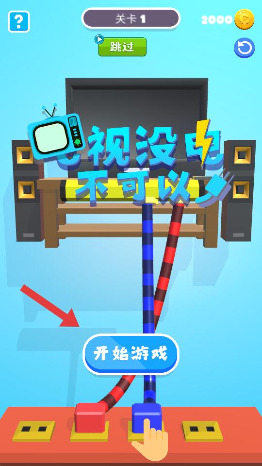 1、進入游戲,處于關卡1,界面有開始游戲按鈕,點擊它即可開啟第一關,解決電視沒電的問題。