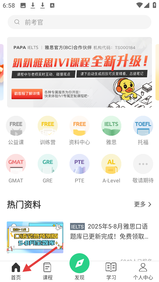 1、點首頁有搜索框與雅思課程廣告,設公益課等學習區,熱門資料醒目,底部是導航欄可快速切換界面。