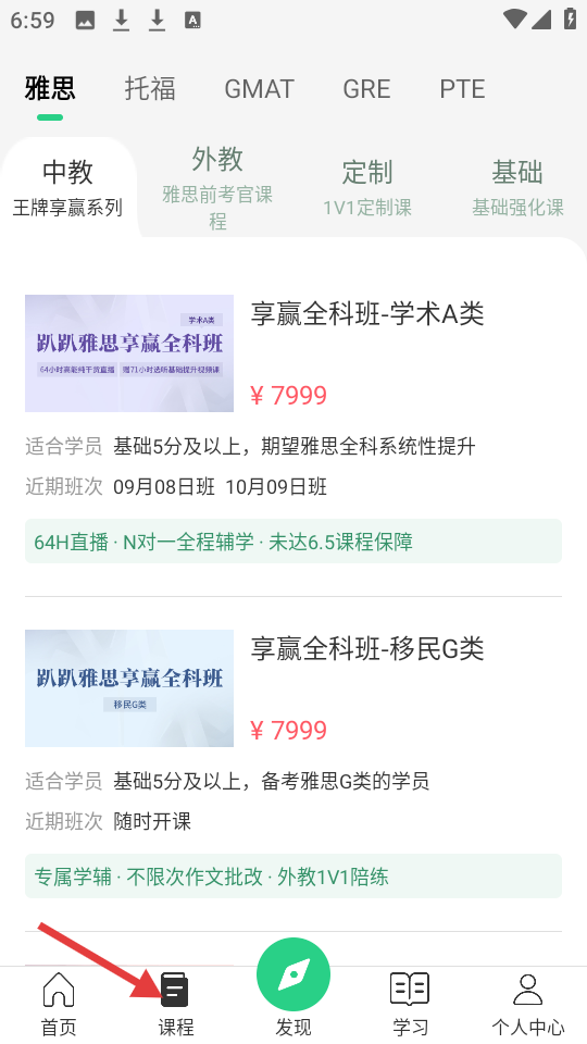 2、點課程界面分雅思托福等類別,展示雅思課程詳情,含價格、適合人群及班次助用戶選合適課程。