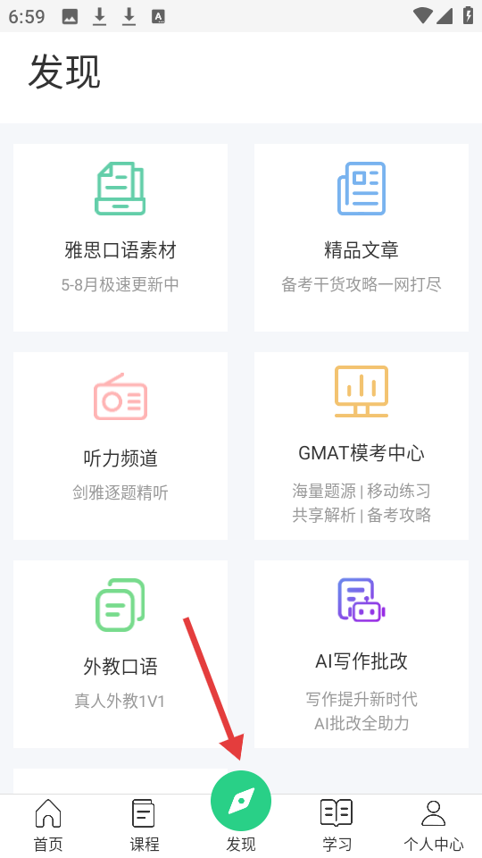 3、點發現頁面陳列雅思口語素材等資源,各模塊有介紹,方便學員找學習資料提升備考效率。