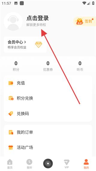 2、切換到我的頁面點擊點擊登錄,登錄后可在VIP會員頻道暢聽會員專屬有聲書,享受聽書樂趣。