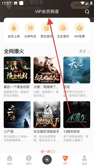 1、進入酷我暢聽VIP會員頻道,可看到會員上新、大神專區等板塊,還有全網爆火的有聲書推薦,若要享受會員權益需先登錄賬號。