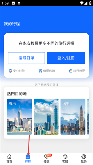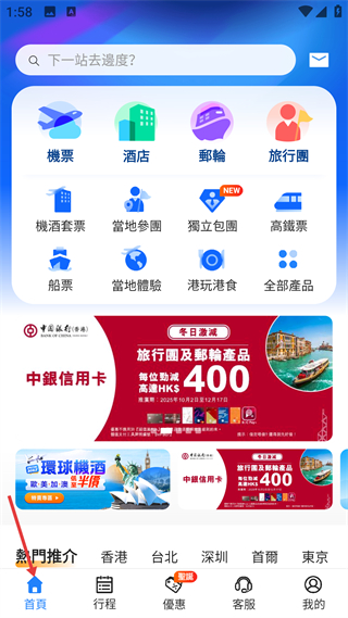 1、首頁聚合機票酒店郵輪等旅行產品入口,展示優惠活動與熱門目的地,是旅行服務的綜合選擇入口。